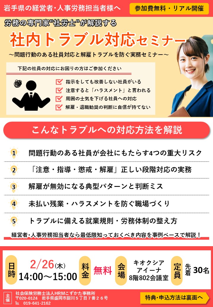 当事務所では、「社内トラブル対応セミナー〜問題行動のある社員対応と解雇トラブルを防ぐ実務セミナー〜」と題し、無料セミナーを実施いたします。